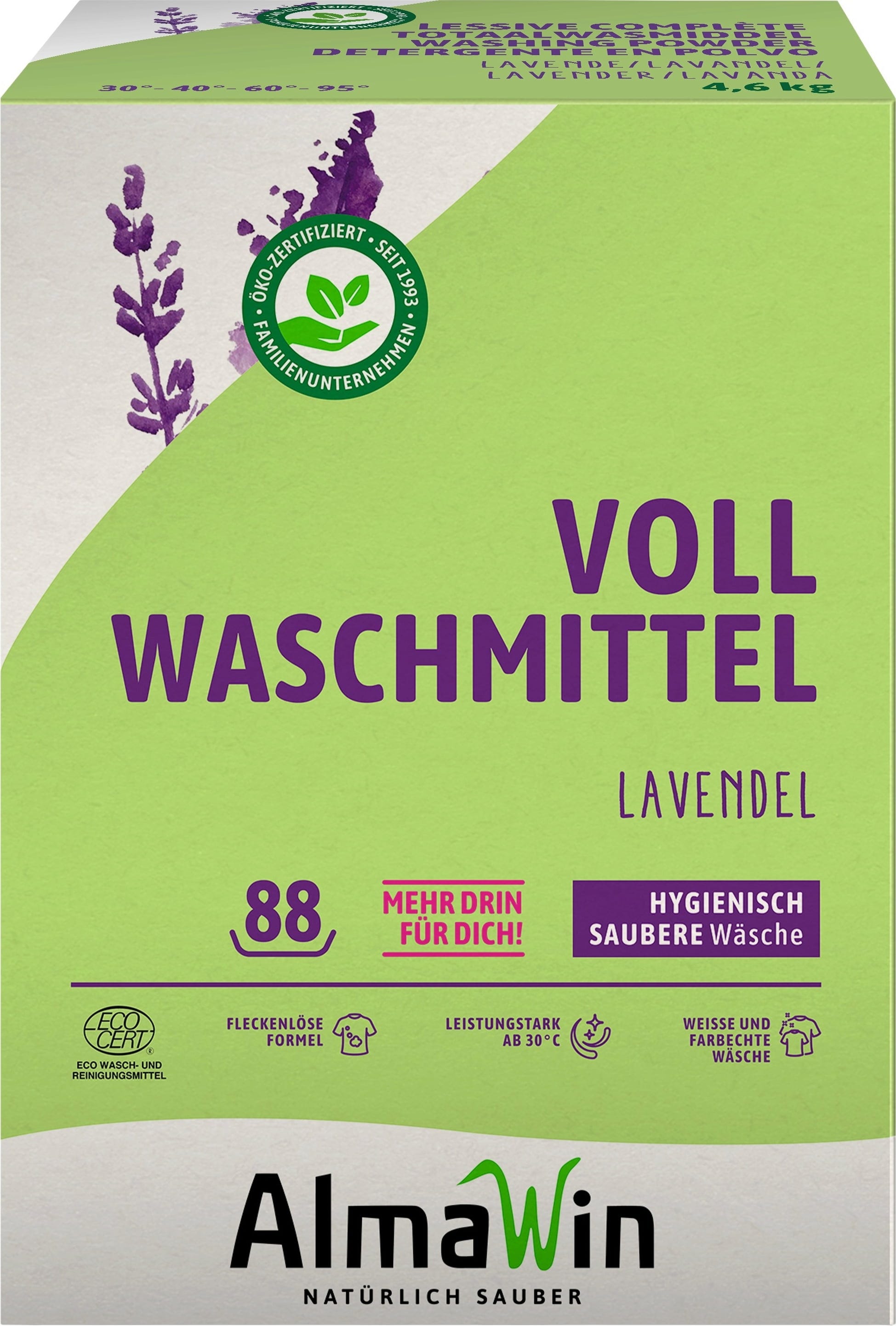 5 % - 15 % Soap, Oxygen-based bleach, < 5 % Anionic surfactants (vegetable fatty alcohol sulphates), Non-ionic surfactants (vegetable sugar surfactants), Fragrances (natural lavandin essential oil, Lavender oil), Linalool, Enzymes (GMO-free protease), Layered silicates, Soda, Sodium hydrogen carbonate, Citric Acid, Sodium salts of polyaspartic acid, Tetraacetylethylenediamine (Bleach activator), natural rice starch