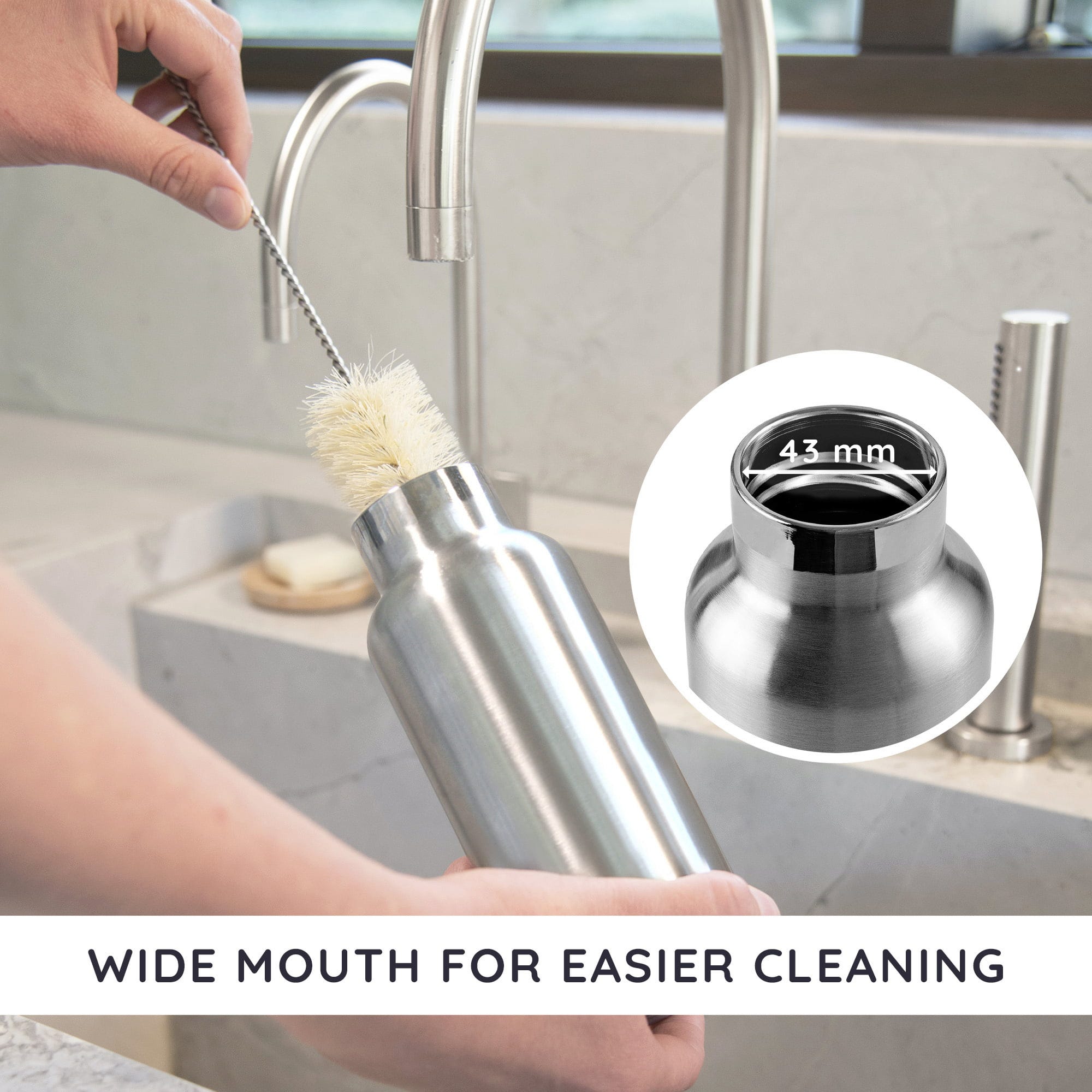 The stainless steel thermos bottle is an elegant and timeless accessory. It is completely free of plastic, has a leak-proof screw cap made of bamboo wood, and features a large opening that can accommodate ice cubes, tea infusers, or fruit. The bottle can keep drinks cold for up to 24 hours on hot summer days and hot for up to 12 hours in winter. Cleaning the bottle is easily done using a brush, making it a convenient option for everyday use.