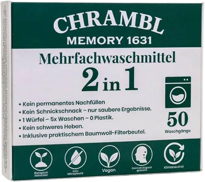 With the Chrambl® multi-purpose washing cube, you are making a significant step towards reducing plastic waste and unnecessary ingredients in the laundry room. This highly concentrated cube automatically doses itself during the washing process, preventing overdosing and eliminating the need for additional fabric softener. The handmade, vegan formula is biodegradable and can be used at temperatures ranging from 30 to 90 °C, suitable for colours, whites, and functional laundry. Its compact design eliminates the need to lift heavy canisters, and the included cotton bag ensures clean and easy handling.