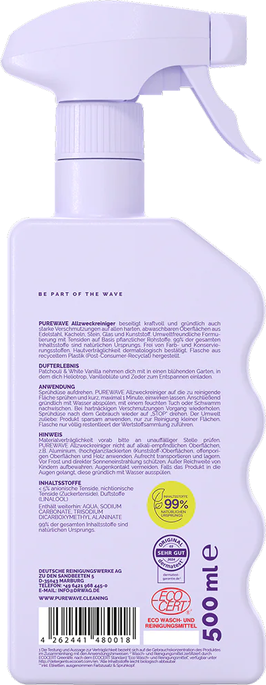 - Do not use PUREWAVE All-Purpose Cleaner on alkali-sensitive surfaces, e.g. aluminium, (high-gloss) painted (plastic) surfaces, open-pored surfaces, or wood.