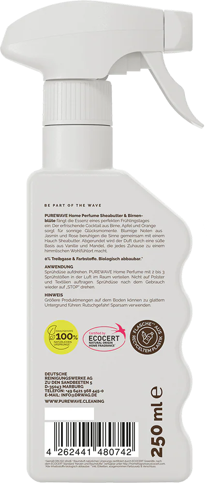 The Shea Butter & Peach Blossom Home Perfume invites you to leave the stresses of everyday life behind and instead bring warmth and comfort into your home. The fragrance combination of juicy pears, apples and tangy oranges fills the air before the aroma fades into a floral heart of jasmine and rose. Rounded off with a luxurious hint of shea butter, lovely vanilla and musk, the room spray awakens the mind and inspires the senses.